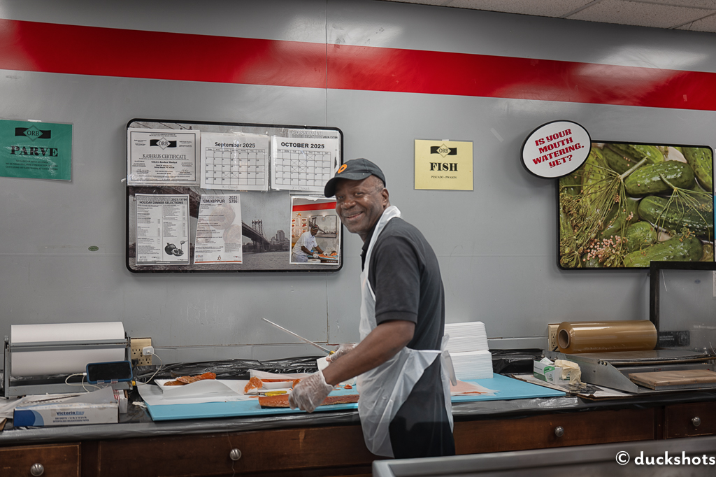 This High Holidays, I returned to buy traditional foods, appetizing, fishes, challah bread, salad. One subject, Max, the greatest lox slicer in the world, still works at the store. He’s like an institution. Behind his station hung the image I shot.